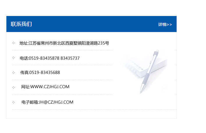 地址:常州市新北區友邦商務大廈1幢16、17層  電話:0519-85101652  傳真:0519-85112595  郵編:213022  網址:www.cz-jiayue_cn.lzhhmy1.com  郵箱:xiajifengaa@163.com